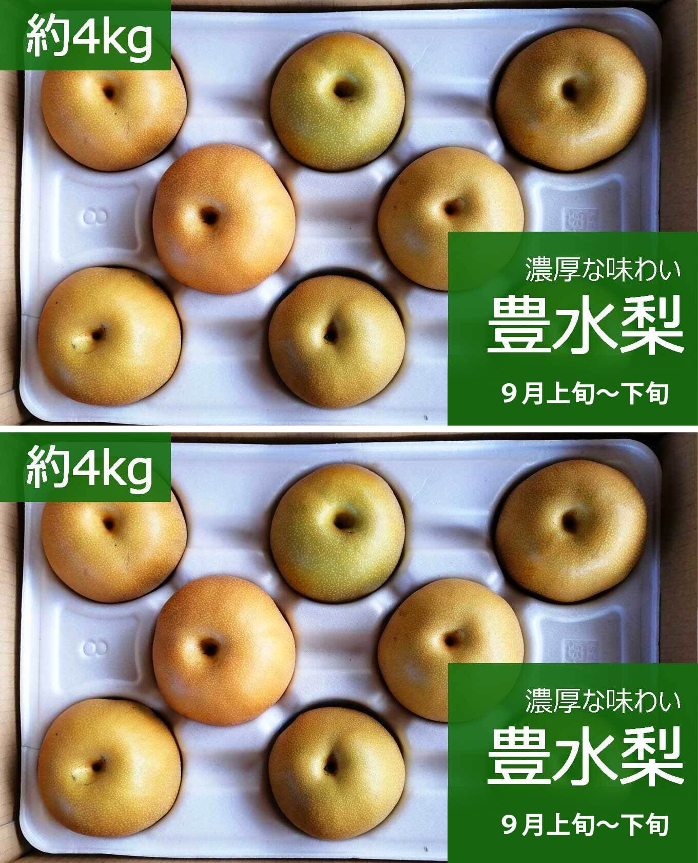 【重要】豊水は「みつ症」といって、果肉が部分的に半透明になる症状があります。豊水によくみられる自然現象で、腐っているわけではありませんので食べられます。出荷時の外観からの判別が困難です。豊楽園ではできるだけ完熟の梨を収穫しており、「みつ症」の可能性も高くなります。