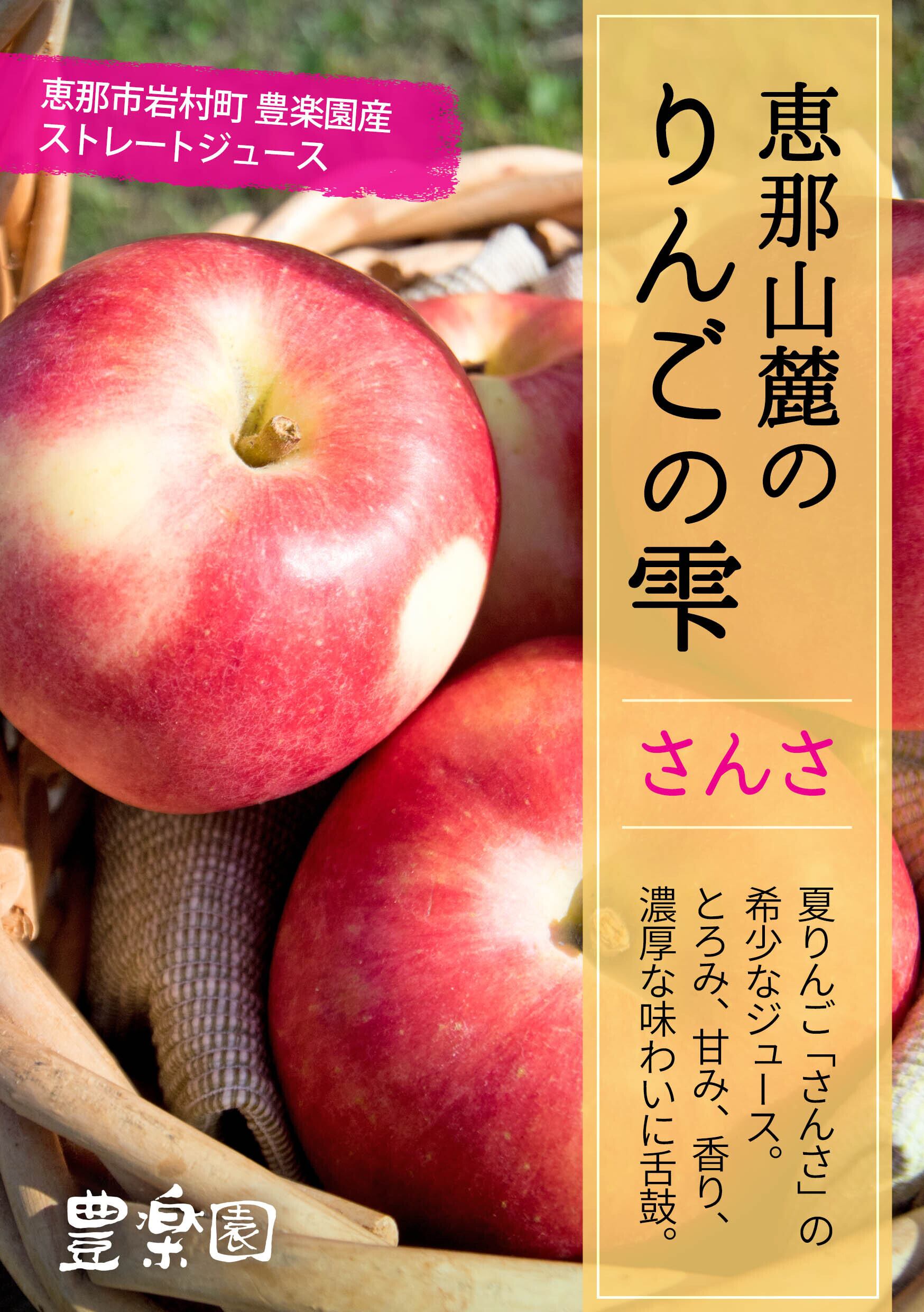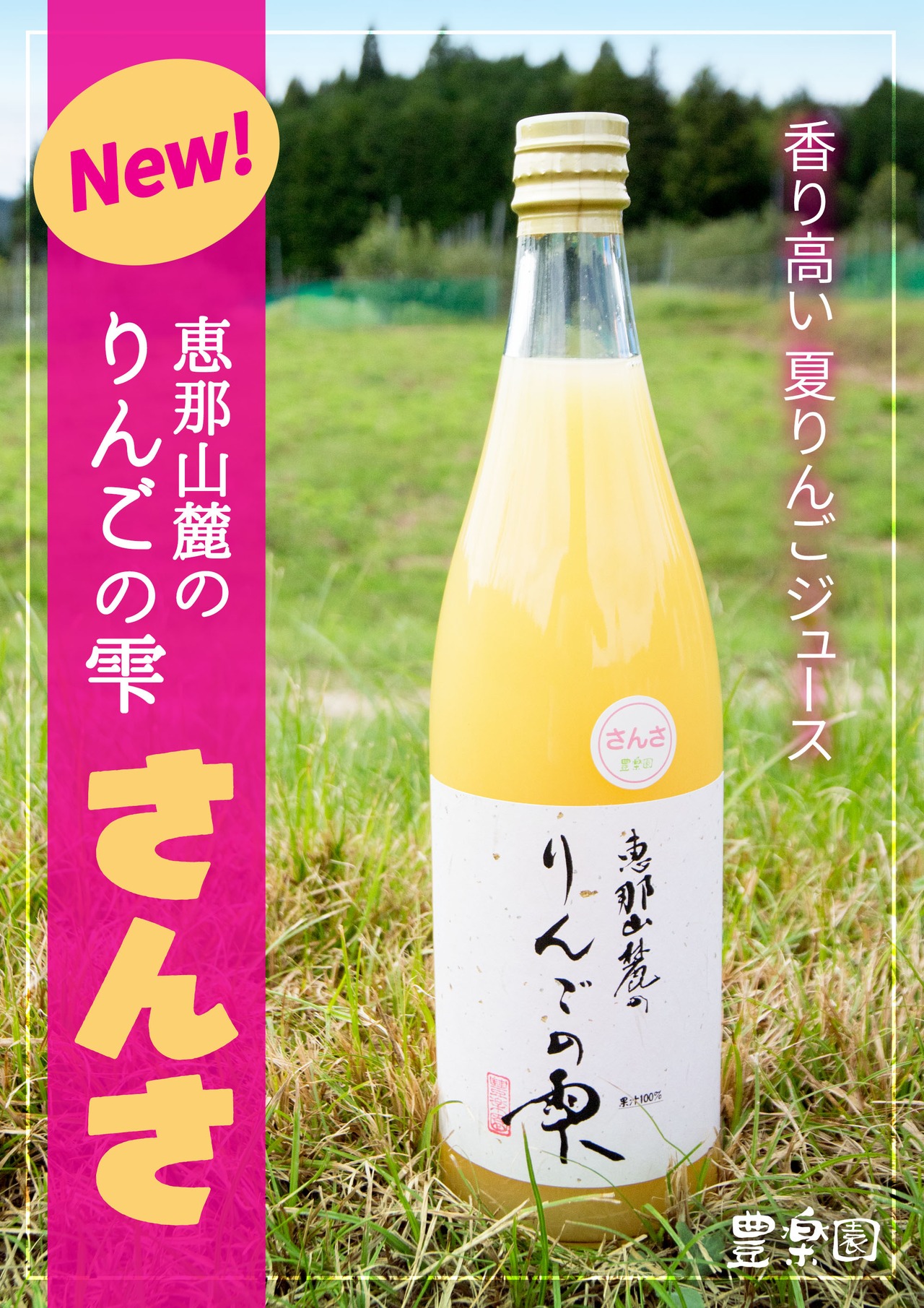 豊楽園で収穫された新鮮な "さんさ" りんごを、そのまますりおろしてビン詰めしたジュースです。食物繊維と一緒に美味しい100%天然果汁を味わえ、皆様の健康な暮らしを彩ってくれます。