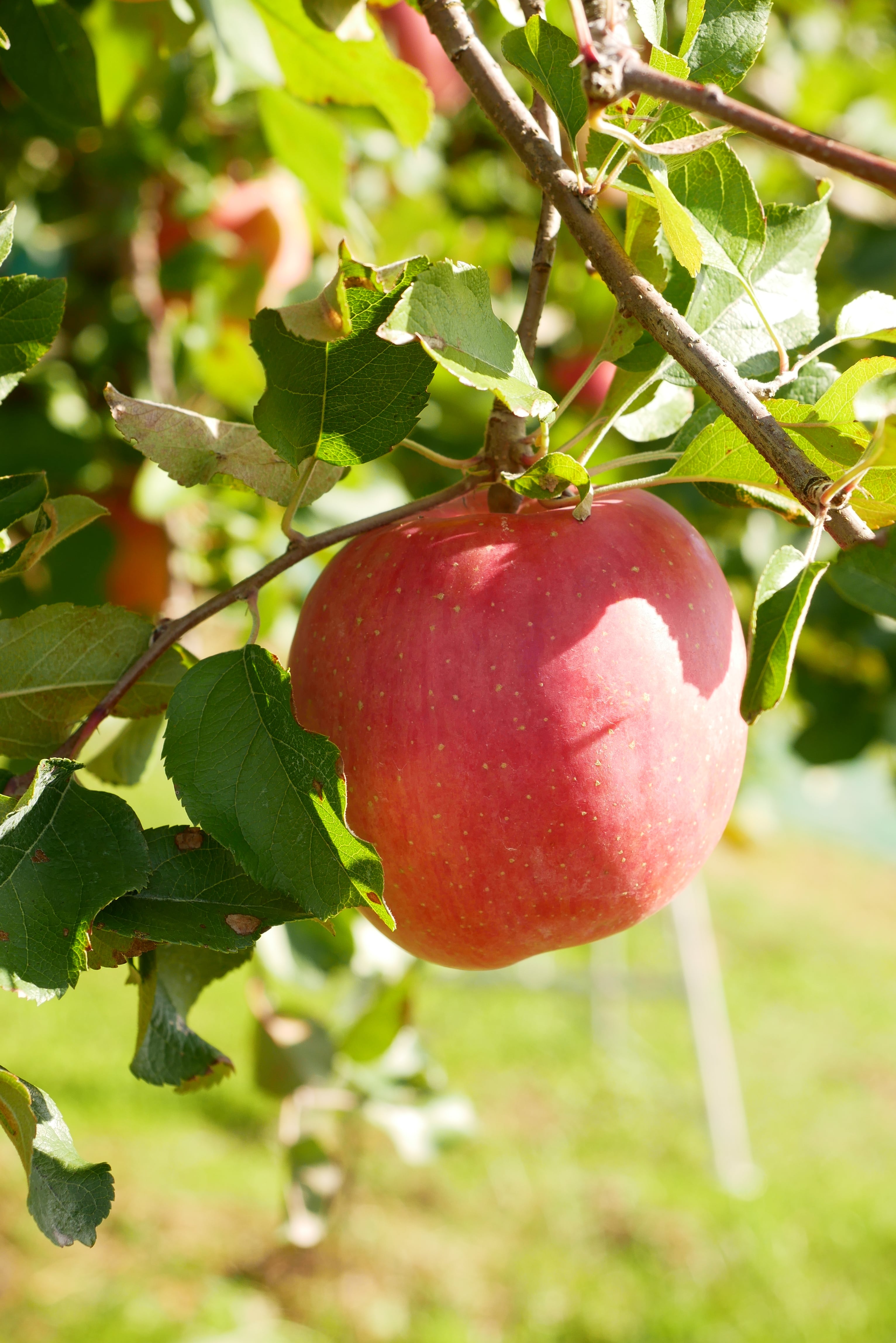 「ふじ」…りんごの定番品種。甘、酸のバランスがよく、ハッキリした濃い味です。豊楽園のふじはパリッと固く身が締まっており、日持ちもします。