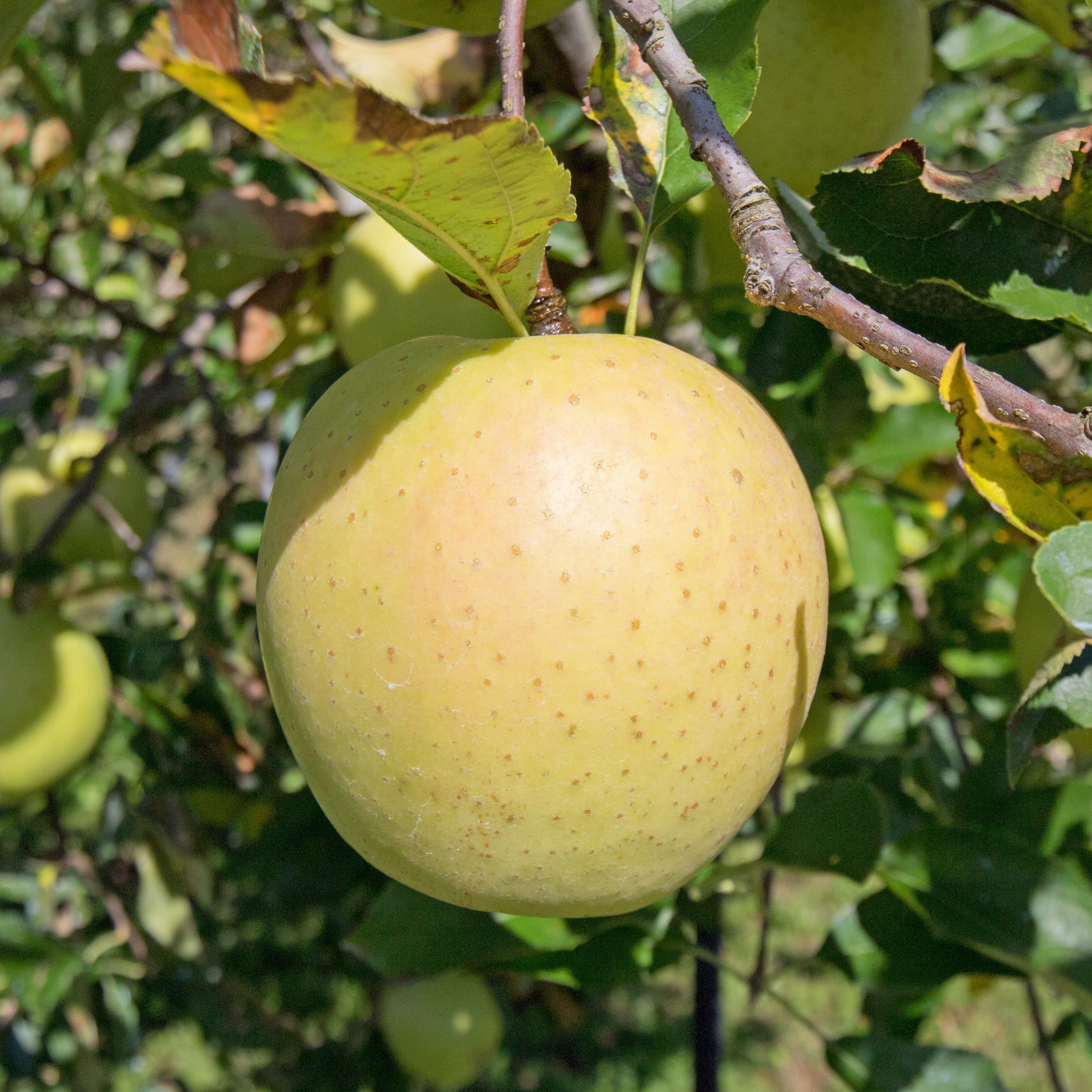 「王林」…青~黄色のりんごの代表品種。王林ならではの香りとジューシーさが魅力。採りたて新鮮な王林はシャキシャキ食感です。
