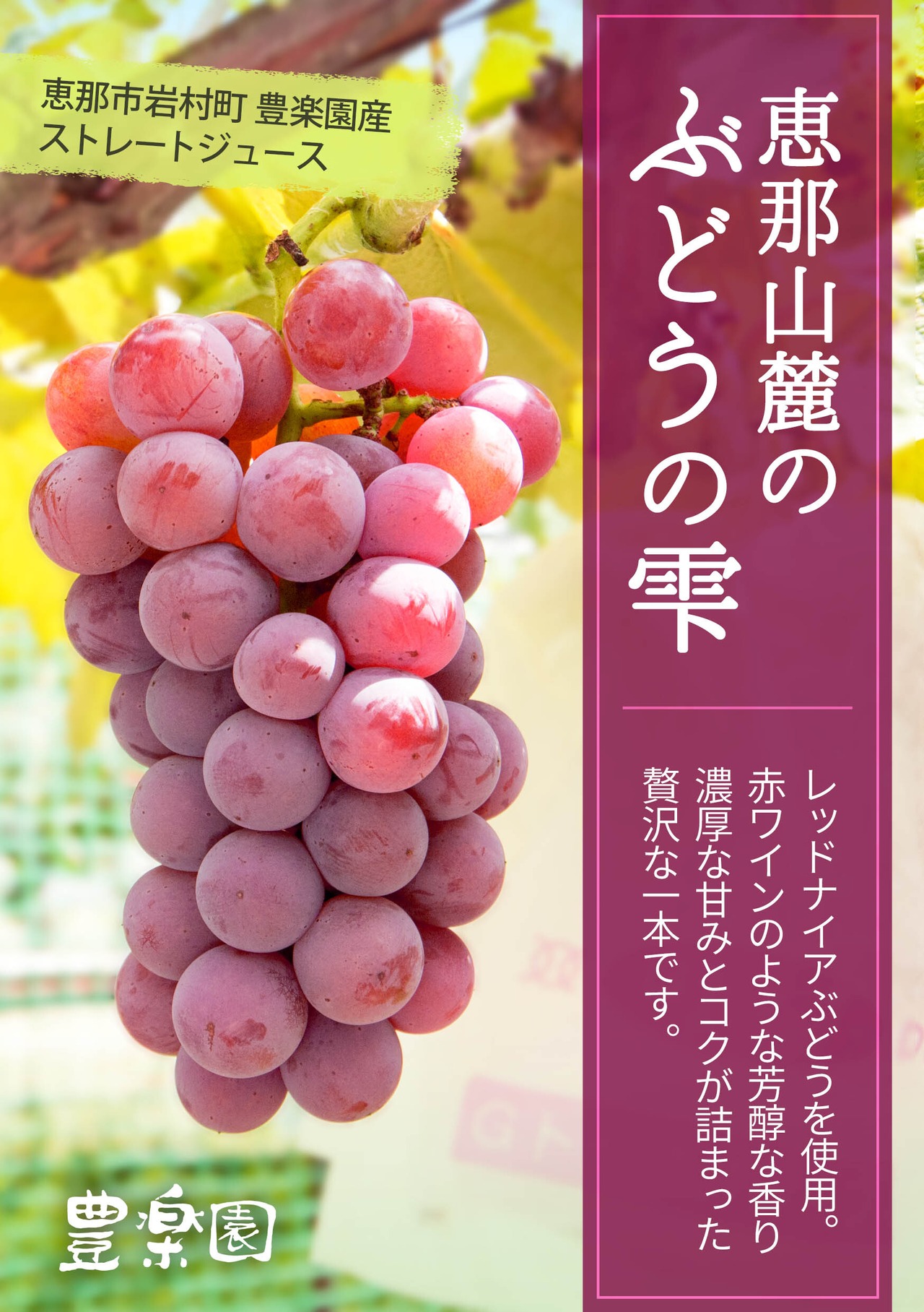 豊楽園で収穫された新鮮なぶどう、りんごを、そのまますりおろしてビン詰めしたジュースです。食物繊維と一緒に美味しい100%天然果汁を味わえ、皆様の健康な暮らしを彩ってくれます。